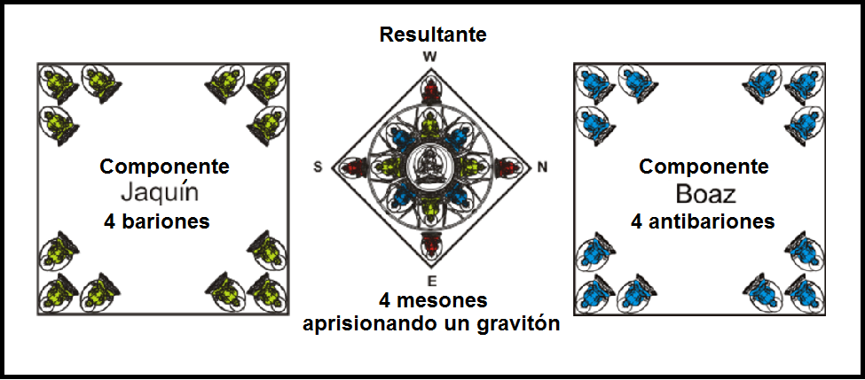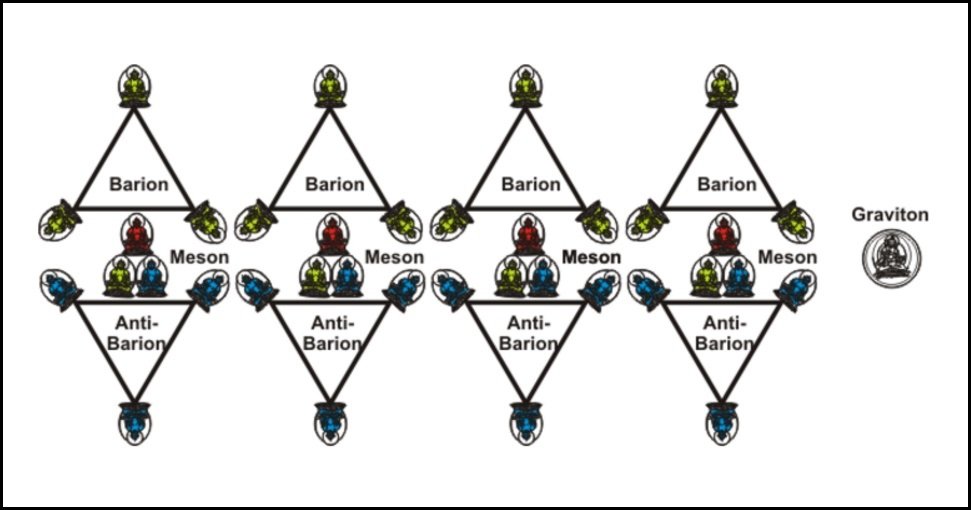 Los bariones, antibariones, y mesones son partículas fugaces, sólo extisten por breve tiempo; y se desplazan formando doce espirales de tres subpartículas por espiral siguiendo las doce lineas de energía del vector en equilibrio en cuyo centro tenía su asiento el gravitón cuyo trono era el agujero de gusano del fotón.