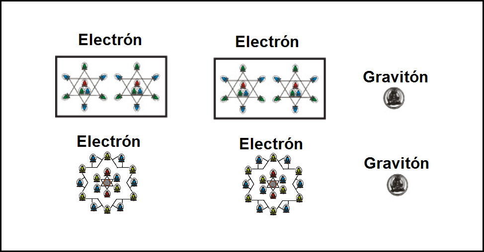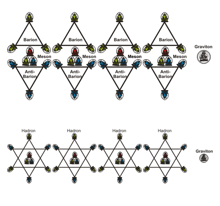 Reitero, en la desitengración del fotón, los bariones, antibariones y mesones son partículas fugaces, estas automaticamente se organizan en 4 hadrones, y estos últimos a su vez se organizan en parejas formando dos electrones, uno con polaridad solar y otro con polaridad lunar. El gravitón siempre queda libre.