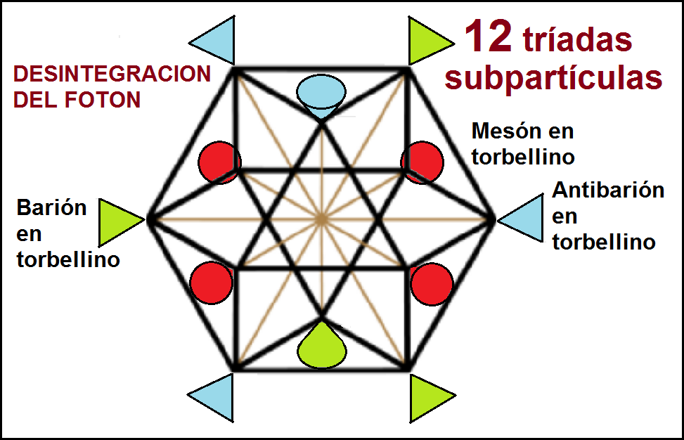 Cuando un neutrino de quraks de alta energía colisiona con el núcleo de un fotón, dicho fotón se desintegra liberando 4 bariones, 4 antibariones, 4 mesones y un gravitón.El barión está conformado por 3 quarks, el antibarión por 3 antiquarks, y el mesón por: 1 quarks + 1 antiquarks + 1 neutrino. Todo esto dice que en la desintegración del fotón sus partículas se separan organizadas en doce grupos de 3 subpartículas.